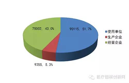 截止2014年12月31日,在全國(guó)醫(yī)療器械不良事件監(jiān)測(cè)系統(tǒng)中,注冊(cè)基層用戶(hù)(包括生產(chǎn)企業(yè)、經(jīng)營(yíng)企業(yè)和使用單位)共174,372家。其中,醫(yī)療器械生產(chǎn)企業(yè)9,255家,占注冊(cè)基層用戶(hù)總數(shù)的5.3%;經(jīng)營(yíng)企業(yè)75,002家,占注冊(cè)基層用戶(hù)的43.0%;使用單位90,115家,占注冊(cè)基層用戶(hù)的51.7%(圖1-4)。