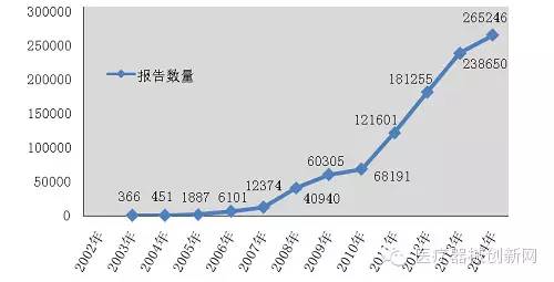 圖1-5 2002-2014年全國(guó)可疑醫(yī)療器械不良事件報(bào)告數(shù)量