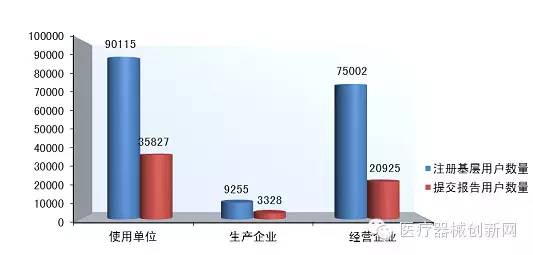 2014年,注冊(cè)基層用戶(hù)數(shù)量達(dá)到174,372,比2013年增長(zhǎng)了17.4%。在所有注冊(cè)基層用戶(hù)中34.5%的用戶(hù)提交過(guò)不良事件報(bào)告。在系統(tǒng)注冊(cè)的9,255家生產(chǎn)企業(yè)用戶(hù)中有3,328家提交了報(bào)告,占36.0%,比2013年提高了5.5%;注冊(cè)的75,002家經(jīng)營(yíng)企業(yè)用戶(hù)中有20,925家提交了報(bào)告,占27.9%,比2013年提高了12.3%;注冊(cè)的90,115家使用單位中有35,827家提交了報(bào)告,占39.8%,比2013年提高了15.2%(圖2-2,圖2-3)。