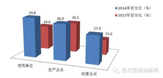 總體來(lái)看,器械不良事件報(bào)告仍主要來(lái)源于器械的使用單位。相比2013年,生產(chǎn)企業(yè)提交報(bào)告所占比例有所下降,與其器械使用安全第一責(zé)任人的地位不符,其履行職責(zé)的自覺(jué)性有待提高。此外,經(jīng)營(yíng)企業(yè)報(bào)告所占百分比也下降了3.1個(gè)百分點(diǎn)。