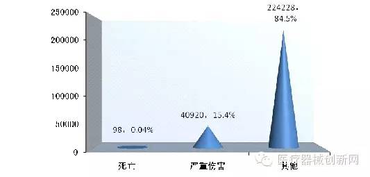 2014年可疑醫(yī)療器械不良事件報(bào)告中,事件傷害為死亡的報(bào)告共98份,占總報(bào)告數(shù)的0.04%;事件為嚴(yán)重傷害的報(bào)告共40,920份,占總報(bào)告數(shù)的15.4%;事件傷害為其他的報(bào)告共224,228份,占總報(bào)告數(shù)的84.5%(圖2-4)。