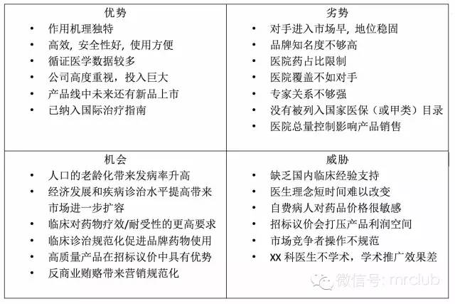 中級(jí)的錯(cuò)誤不再是分類不清,但總結(jié)的因素不是過(guò)于宏觀就是失之于微觀,排列又缺少重點(diǎn),貌似頭頭是道卻讓人看完不知該從何下手。鑒于市場(chǎng)部SWOT一年一做,不要納入2-3年內(nèi)不能對(duì)細(xì)分市場(chǎng)產(chǎn)生影響的外部因素,例如人口老齡化、醫(yī)改、分級(jí)診療、經(jīng)濟(jì)發(fā)展社會(huì)穩(wěn)定之類的宏觀因素,也不建議把影響整體市場(chǎng)不到<10%的因素如部分醫(yī)院進(jìn)藥、部分地區(qū)的招標(biāo)等因素納入,產(chǎn)品經(jīng)理的視角不應(yīng)該跟總經(jīng)理或銷售經(jīng)理重疊。
