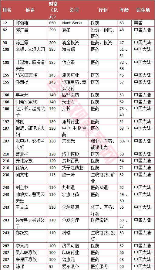 109位醫(yī)藥大佬躋身全球華人富豪榜