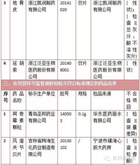四、在使用環節監督抽樣檢驗不符合標準規定的藥品名單:有14批次,10批次為中藥飲片。