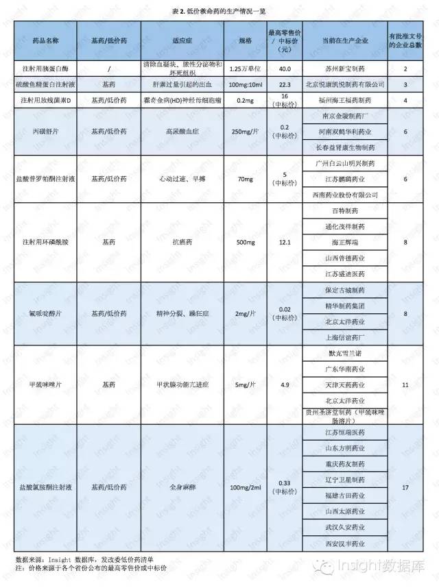 根據(jù) Insight 藥品上市數(shù)據(jù)庫(kù),部分救命廉價(jià)藥目前的生產(chǎn)企業(yè)情況如下圖所示: