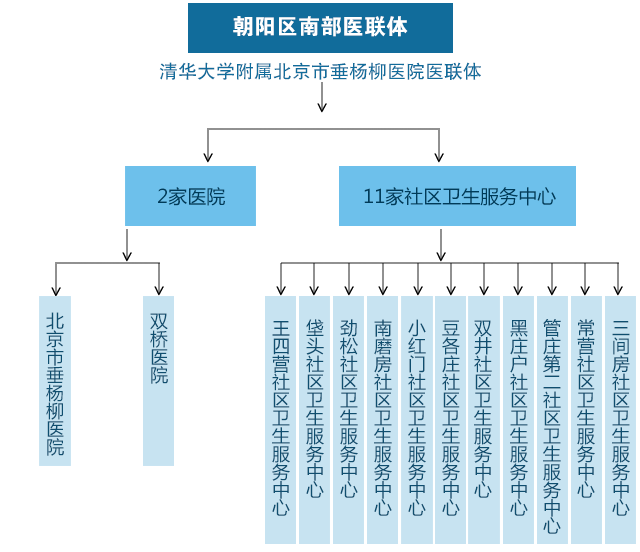朝陽區南部醫聯體:2014年6月,朝陽區南部醫聯體掛牌成立,該醫聯體以清華大學附屬北京市垂楊柳醫院為核心,共包含13家醫療機構,覆蓋王四營、垡頭、雙井等朝陽區南部地區100多萬居民。至此,朝陽區中部、東部、北部、南部4個片區醫聯體已全部建成,實現了區域醫聯體的全覆蓋。