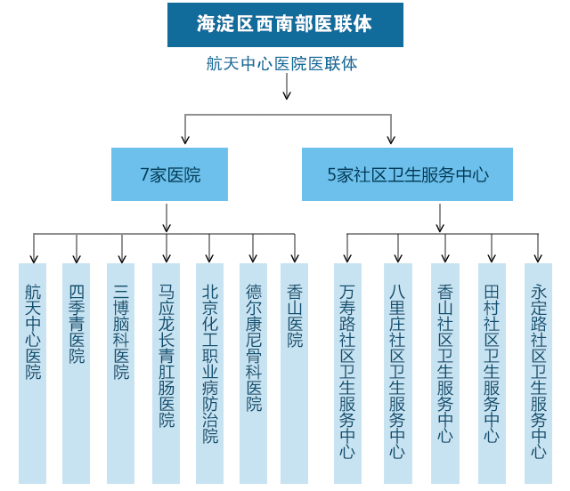 航天中心醫院醫聯體即海淀區西南部醫聯體,包括四季青醫院、三博腦科醫院、馬應龍長青肛腸醫院、北京化工職業病防治院、德爾康尼骨科醫院、香山醫院及海淀區的萬壽路、八里莊、香山、田村、永定路5家社區衛生服務中心。
