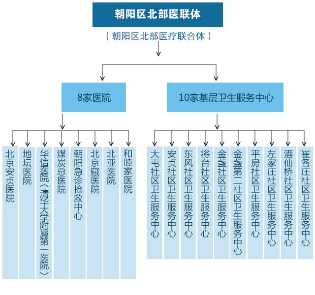 朝陽區北部醫聯體:2014年1月,朝陽區北部醫療聯合體正式成立。醫聯體由18家醫療機構組成,牽頭醫院是北京安貞醫院,成員包括地壇醫院、華信醫院、煤炭總醫院、朝陽急診搶救中心、北京藏醫院、北亞醫院、和睦家醫院以及10家基層衛生服務中心,各成員單位的床位數累計達到近4000張。
