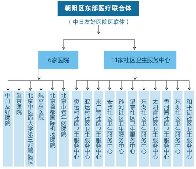 朝陽區東部醫聯體:2014年1月,朝陽區東部醫療聯合體—中日友好醫院醫聯體正式成立,共包括6家醫院和11家社區衛生服務中心,醫聯體內病床數超4400張,可為周邊大約150萬人提供三級醫療服務。中日友好醫院醫聯體是本市的第四家醫聯體,也是首家由國家衛生計生委直屬醫院牽頭成立的醫聯體。中日友好醫院為牽頭單位,該醫聯體成員單位還包括望京醫院、北京中醫藥大學第三附屬醫院、航空總醫院、北京首都國際機場醫院、北京市老年病醫院,以及奧運村、亞運村、來廣營、安貞、孫河、望京、東湖、太陽宮、香河園、東壩、和平街11家社區衛生服務中心。