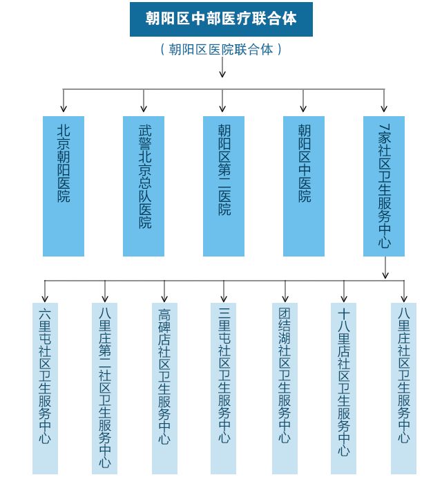 朝陽區中部醫療聯合體:朝陽醫院醫聯體 2012年11月7號正式成立運行,由北京朝陽區在北京市率先啟動了分級診療服務模式,北京朝陽醫院醫聯體除了北京朝陽醫院外,還有武警北京市總隊醫院、朝陽區第二醫院、朝陽區中醫院以及7家社區衛生服務中心:六里屯社區衛生服務中心、八里莊第二社區衛生服務中心、高碑店社區衛生服務中心、三里屯社區衛生服務中心、團結湖社區衛生服務中心、十八里店社區衛生服務中心和八里莊社區衛生服務中心,運行以來,取得了積極成效。