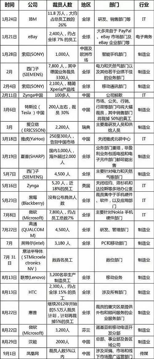 2015年全球部分企業裁員盤點(表格來源:搜狐財經)