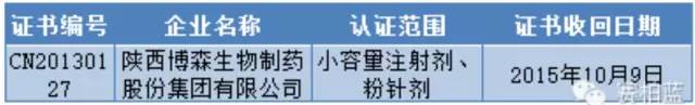 10月13日,陜西省食藥監(jiān)局發(fā)布公告,收回陜西博森生物制藥股份集團(tuán)有限公司的GMP證書。