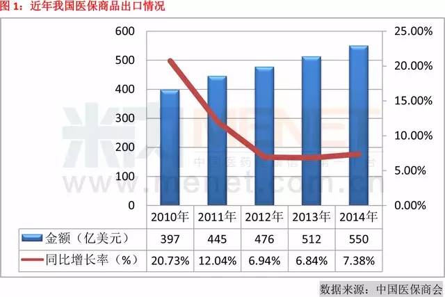由于國內(nèi)醫(yī)藥市場的蓬勃發(fā)展和國家鼓勵(lì)進(jìn)口的政策顯效,我國醫(yī)藥貿(mào)易順差在逐步縮小,“十五”期間醫(yī)藥出口額復(fù)合增長率達(dá)37.77%,“十一五”期間,受國際金融危機(jī)影響,外貿(mào)需求有所萎靡,復(fù)合增長率下降到19.22%,到了2012年開始,僅有個(gè)位數(shù)的增長。2014年我國醫(yī)藥產(chǎn)品實(shí)現(xiàn)出口550億美元,同比增長7.38%。