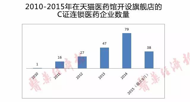 據(jù)統(tǒng)計,截至2015年9月,在天貓醫(yī)藥館開設(shè)大藥房旗艦店的C證連鎖醫(yī)藥企業(yè)數(shù)量為208家。按年劃分,2014年開店數(shù)量最多,達(dá)到79家,平均每月超過6家。2015年1-9月開店數(shù)量為38家,平均每月約為4家,開店數(shù)量低于2014年。