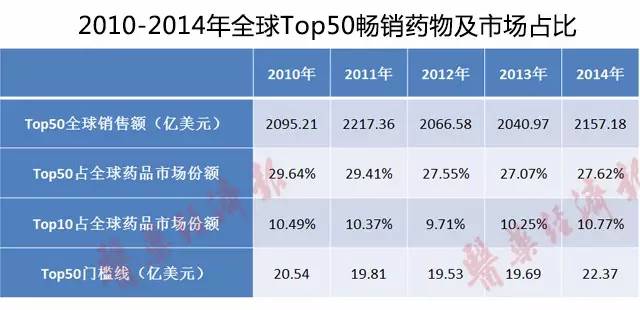 根據EvaluatePharm的統計顯示,2014年全球暢銷藥物50強總銷售額達到了2157.18億美元,占全球處方藥及OTC藥物市場總額的27.62%,相比2013年有所提升,該比例在2010-2014年均保持在27%以上。其中前十強占總體藥物市場的10.77%,該比例自2012年低于10%以下,為9.71%外,歷年均在10%以上。可以看出全球暢銷藥50強對世界藥物市場格局的影響巨大。受多種因素的而影響,傳統重磅藥物的市場主導地位正在不斷削弱,暢銷藥物對全球銷售額的貢獻率處于下降趨勢。