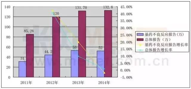 據《國家藥品不良反應監測年度報告(2014年)》數據顯示,2014年全國藥品不良反應監測網絡共收到國家基本藥物的不良反應/事件報告52.0萬例(占2014年總體報告的39.2%),其中嚴重報告2.9萬例,占5.6%。報告涉及化學藥品和生物制品病例報告占82.9%,中成藥病例報告占17.1%。不良反應報告增長率逐年下降,2014年出現了負增長。