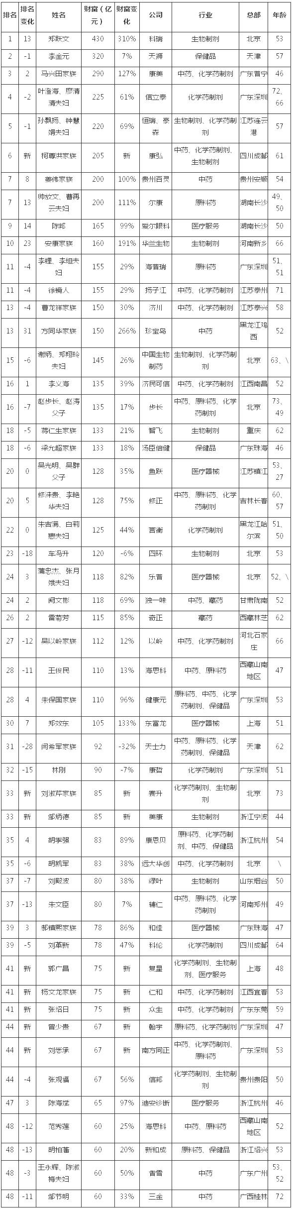 醫藥富豪是這樣煉成的:胡潤醫藥富豪榜TOP50(完整榜單)