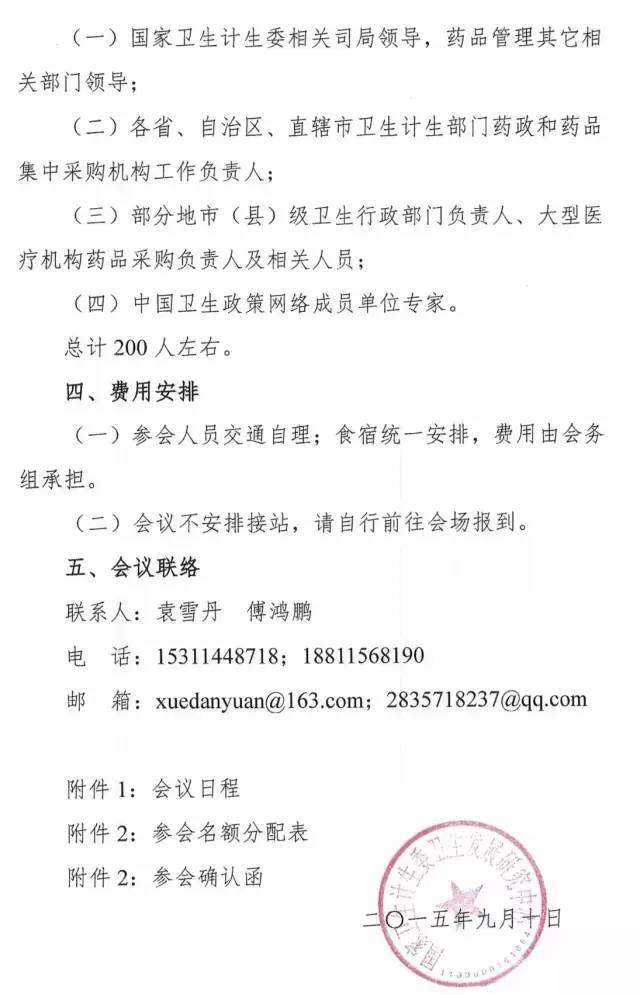 會議召開時間為今天(10月31日),參會人員包括國家衛計委相關司局領導、藥品管理其它相關部門領導;各省(自治區、直轄市)衛生計生部門藥政和藥品集中采購機構工作負責人;部分地市(縣)及衛生行政部門負責人、大型醫療機構藥品采購負責人及相關人員;中國衛生政策網絡成員單位專家,總計200人左右。