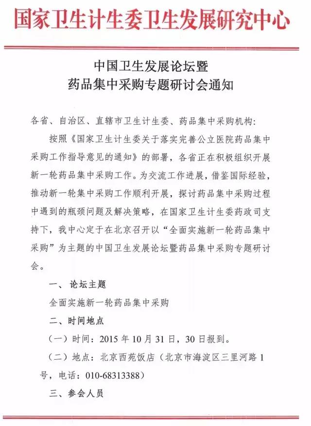 10月27日,聯眾醫藥網微信已將爆料的——國家衛計委衛生發展研究中心近日發布《中國衛生發展論壇暨藥品集中采購專題研討會通知》發布出來了,按照爆料內容,今天便是各省藥品招標辦云集北京開會的日子了,那么本次研討會會講些什么內容呢?