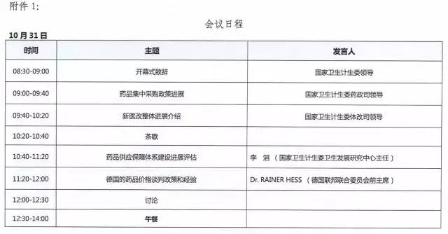 會議的內容將包括“藥品集中采購政策進展”、“新醫改整體進展介紹”、“藥品供應保障體系建議進展評估”、“德國的藥品價格談判政策及經驗”等。