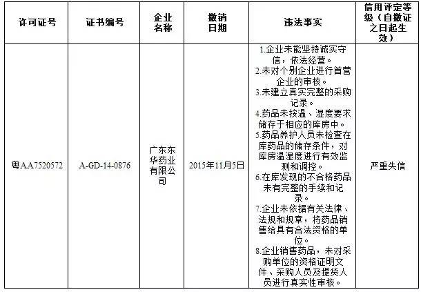 同日,廣東省藥監局發布2015年第25號撤銷GSP認證證書公告,依法撤銷廣東東華藥業有限公司GSP證書,并評定其信用等級為“嚴重失信”。