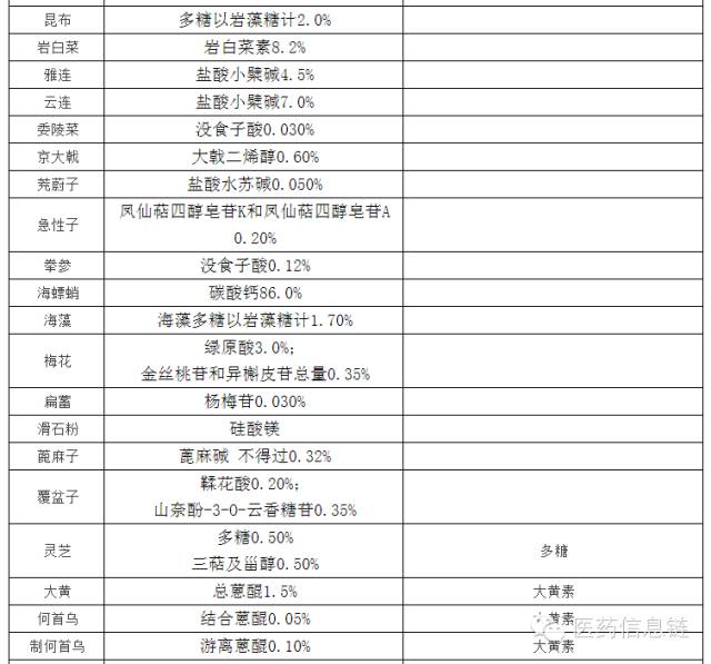 三顆針、干漆、山楂、廣金錢草、女貞子、馬兜鈴、天仙子、升麻、生姜、瓜子金、瓜蔞皮、老鸛草、西青果、紅大戟、花椒、花蕊石、杜仲葉、豆蔻、牡蠣、余甘子、沙苑子、訶子、補(bǔ)骨脂、苦杏仁、苦楝皮、虎杖、知母、使君子、金果欖、金銀花、魚腥草、卷柏、油松節(jié)、韭菜子、骨碎補(bǔ)、鉤藤、胖大海、夏枯草、浮萍、預(yù)知子、菊花、野木瓜、款冬花、棕櫚、紫蘇葉、紫蘇梗、鎖陽、藍(lán)布正、槐角、錦燈籠、豨薟草、暴馬子皮、薤白、瞿麥、翻白草
