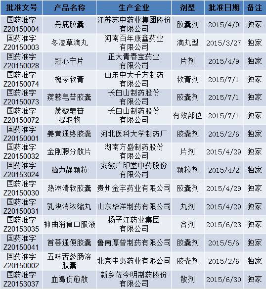 2015年CFDA批準的中藥品種(獨家品種) 表1