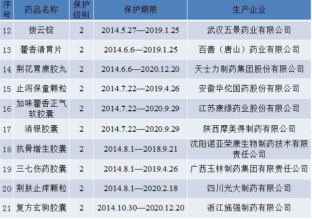 根據《中藥品種保護條例》第十六條及有關規定,經國家中藥品種保護審評委員會組織的委員審評、國家食品藥品監督管理總局核準,我們統計了2015年21家企業生產的21個中藥延長保護期品種,具體信息見下表。