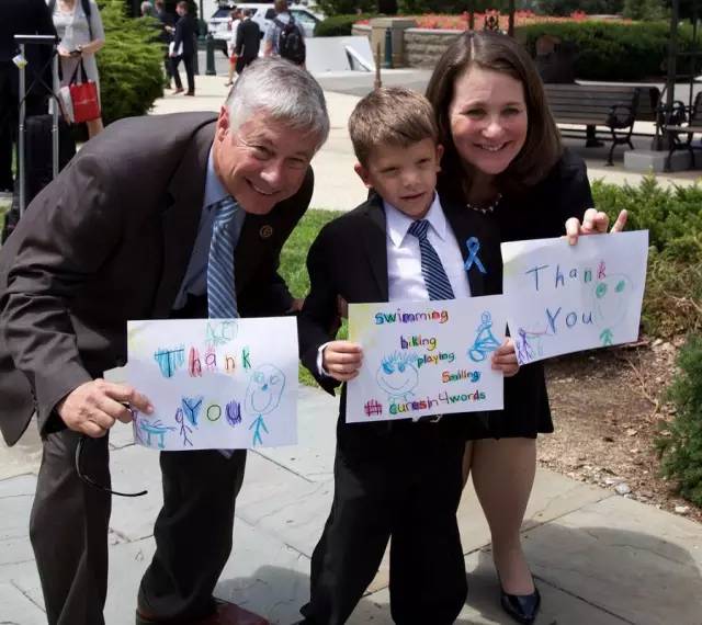 美國眾議員Fred Upton(左)、Diana DeGette(右)與一名患有罕見基因疾病的6歲男孩一起慶祝《21世紀(jì)治愈法案》獲得眾議院通過。