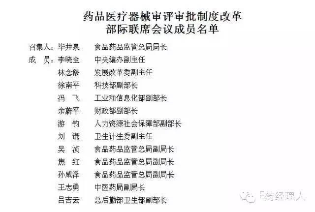 聯席會議由食品藥品監管總局、中央編辦、發展改革委、科技部、工業和信息化部、財政部、人力資源社會保障部、衛生計生委、中醫藥局、總后勤部衛生部等10個部門和單位組成。
