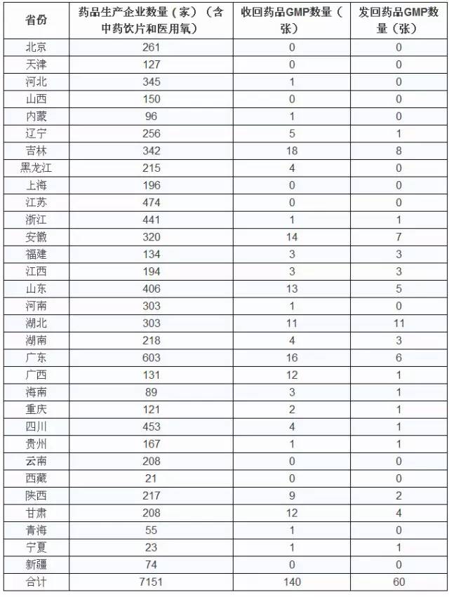 來源:醫(yī)藥手機(jī)報(bào) 國家藥監(jiān)總局在統(tǒng)計(jì)表中詳細(xì)的列出了全國各省收回藥品GMP證書、發(fā)回藥品GMP證書數(shù)量。值得注意的是,今年收回藥品GMP證書數(shù)量最多的省份是吉林省,收回18張,發(fā)回8張;緊隨其后的是廣東省,收回16張,發(fā)回6張;排名第三的是安徽省,收回14張,發(fā)回7張。 此外,今年收回藥品GMP證書數(shù)量為“0”的省份包括北京、天津、山西、上海、江蘇、云南、西藏、新疆等8個(gè)。