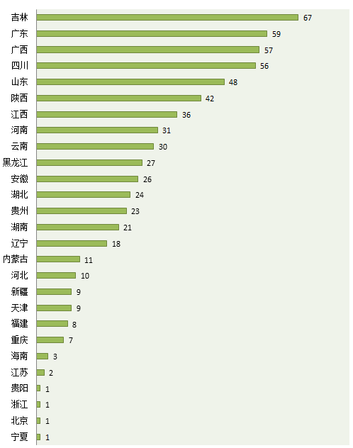 咸達(dá)數(shù)據(jù)V3.2對已過2010年版GMP的數(shù)據(jù)跟蹤發(fā)現(xiàn),目前已有1072家企業(yè)獲得顆粒劑的GMP證書,擁有提取的GMP證書有917家企業(yè),同時(shí)擁有提取和顆粒劑GMP的生產(chǎn)廠家有628家。吉林省有潛力擴(kuò)大生產(chǎn)范圍的企業(yè)數(shù)最多,共67家;廣東有59家排第二;廣西有57家企業(yè),四川有56家,山東有48家,分別位列第3和第5。