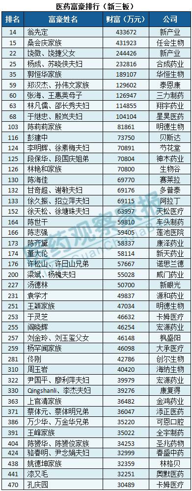 新三板藥企富豪榜單揭曉,誰是NO.1?