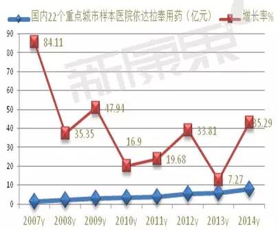 2014年國內22個重點城市樣本醫院腦血管用藥領域中,依達拉奉注射液用藥已達到7.65億元的市場規模,同比上一年增長了35.29%,按照習慣性測算,國內總體市場已超過30億元。