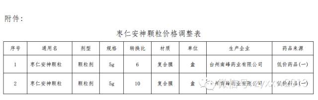 浙江省關(guān)于調(diào)整臺(tái)州南峰藥業(yè)有限公司棗仁安神顆粒參照價(jià)的通知