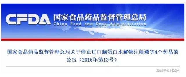 關于停止進口腦蛋白水解物注射液等4個藥品的公告(2016年第13號)