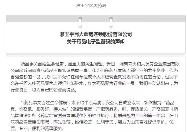 今天,多家百強藥店連鎖發生罕見的集體刷屏,各家的官方微信號陸續發出內容相同或類似的反對電子監管碼的聲明:(包括但不限于以下連鎖藥房)
