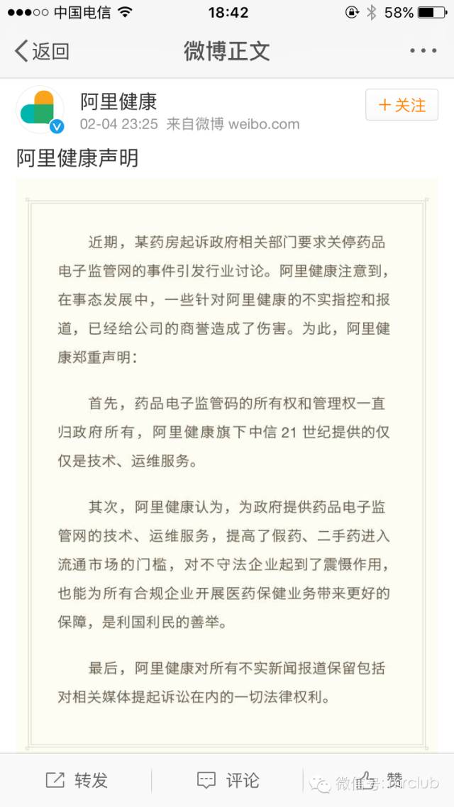 2月5日消息,阿里健康官方凌晨發(fā)布微博,再次重申藥品電子監(jiān)管碼所有權(quán)和管理權(quán)一直歸政府所有一事。