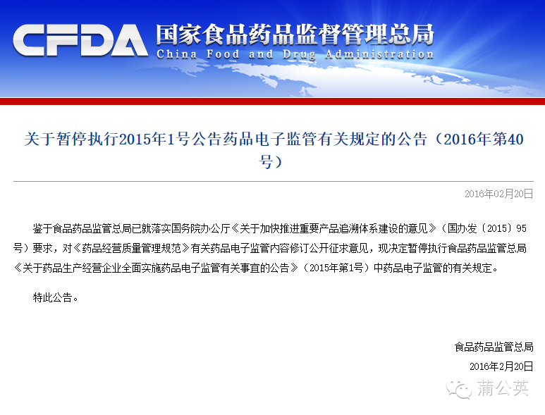 2月20日,CFDA發布了《關于暫停執行2015年1號公告藥品電子監管有關規定的公告(2016年第40號)》如圖: