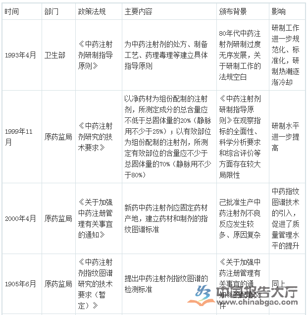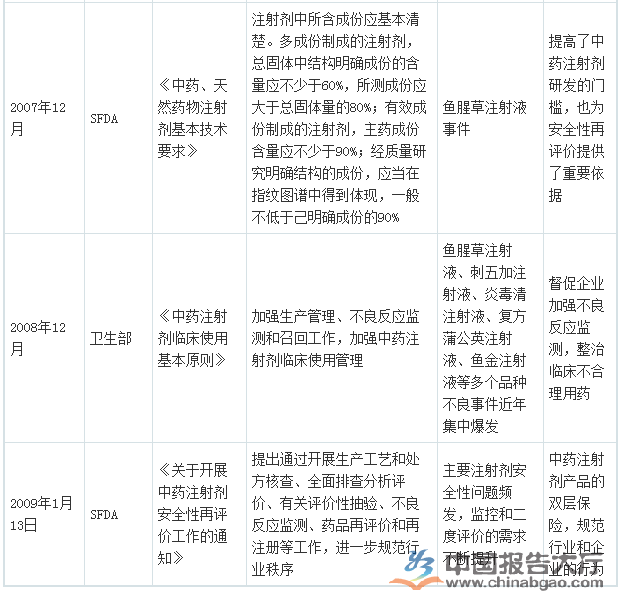 2007年12月頒布的《中藥、天然藥物注射劑基本技術要求》和2009年1月頒布的《中藥注射劑安全性再評價工作方案》對于我國中藥注射劑行業的影響最為深刻。行業理念政策匯總如下: