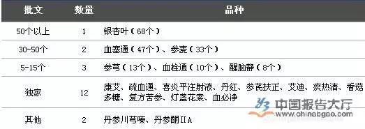 在市場排名前20種注射劑中,獨家品種有12個,比重高達60%,批文在50個以上的只有銀杏葉1個。