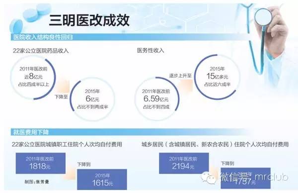 將樂縣醫院收入結構的變化,也是三明市22家公立醫院的一個縮影。22家公立醫院藥品收入由2011年醫改前的近8億元、占比四成半以上,下降至2015年的6億元、占比不到兩成半;醫務性收入則由6.59億元、占比不到四成,逐步上升至2015年的15億多元、占比近六成半。