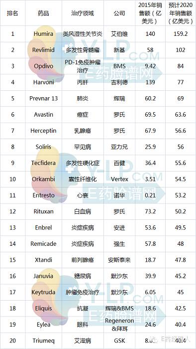 根據(jù)此榜單,2020年全球銷(xiāo)售額最高的產(chǎn)品來(lái)自艾伯維治療類(lèi)風(fēng)濕性關(guān)節(jié)炎的藥品修美樂(lè)(Humira),預(yù)計(jì)其銷(xiāo)售額可達(dá)159.2億美元。艾伯維早些時(shí)候公布了2015年財(cái)務(wù)報(bào)告,修美樂(lè)以140億美元的年銷(xiāo)售額打破了立普妥在2006年創(chuàng)下的年銷(xiāo)售額128.86億美元的記錄。