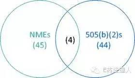 2015年FDA新藥批準數(shù)量有很大提升,共有45個新藥獲得批準,而按照505(b)(2)途徑批準的藥物數(shù)量與新藥批準的數(shù)量基本相當。在45個新藥中,有4個是通過505(b)(2)途徑批準的,如下圖所示。