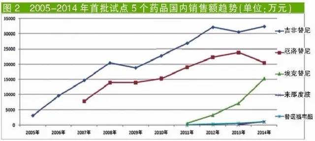 據(jù)國內(nèi)樣本醫(yī)院數(shù)據(jù)統(tǒng)計,國內(nèi)替尼類用藥市場規(guī)模從2005年的5339萬元增長到2014年的14.9億元,2014年同比增長38.2%。國內(nèi)替尼類藥物自上市以來一直保持較高的增長速度,2005-2014年復合增長率高達44.7%,9年整體市場增長27.8倍。