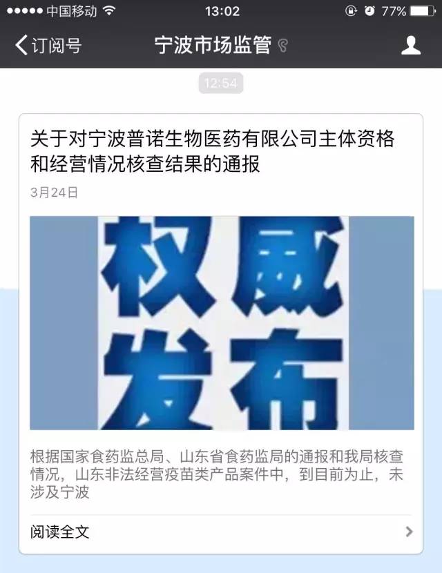 根據國家食藥監總局、山東省食藥監局的通報和我局核查情況,山東非法經營疫苗類產品案件中,到目前為止,未涉及寧波企業。針對網絡輿情中反映的寧波普諾生物醫藥有限公司,寧波市市場監督管理局已經著手對其主體資格和經營情況進行調查,現將有關核查情況通報如下: