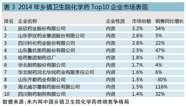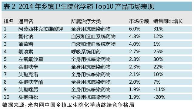 從廠家角度看,農村基層目前仍舊是內資企業的天下,外資企業鞭長莫及。農村基層醫療機構用藥Top 10企業基本上都是抗菌素生產廠家。其中,湘北威爾曼制藥股份有限公司的產品銷售增長翻倍,辰欣藥業股份有限公司也有超過50%的銷售增長,從這些快速增長企業的主打產品可以一窺未來鄉鎮衛生院藥物市場的變化趨勢。