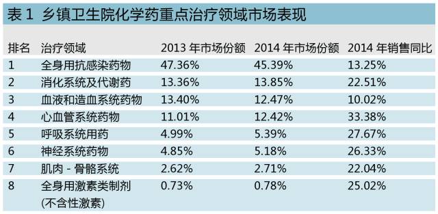 從化藥Top 10品種分布看,農村基層抗菌藥仍是主打,此外就是氯化鈉、葡萄糖等大輸液品種。排名首位的阿莫西林克拉維酸鉀2014年同比增長超過30%,顯示出其在農村市場仍有很大的拓展空間。單從全身用抗菌藥物的使用結構來看,在城市醫院銷售排名首位的哌拉西林他唑巴坦在鄉鎮衛生院市場Top 10品種中不見蹤影;而在城市醫院銷售排不進前十的阿莫西林克拉維酸鉀在鄉鎮衛生院排名首位,這種藥物已經徹底下沉至基層終端市場。其他如頭孢克洛、頭孢呋辛酯、頭孢唑肟、頭孢曲松等上一代頭孢品種在城市醫院中已經排不進前十,但在鄉鎮衛生院中仍占有重要地位。左氧氟沙星、頭孢呋辛兩種藥物無論在城市醫院還是鄉鎮衛生院均排在全身用抗菌藥物銷售額前三品種位置,這兩個品種無論療效還是渠道的鋪貨均得到市場肯定。