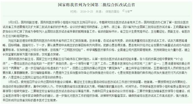 據賽柏藍了解,以省級為單位的綜合醫改試點始于2014年底,是國家在縣級公立醫院改革基本全覆蓋、城市級改革試點進一步擴大基礎上推出的新舉措。
