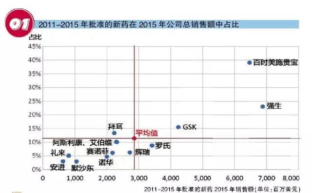● 13家藥企的平均銷售水平難以確定。基礎數據顯示,這些藥企每年研發支出總計約為750億美元,但2011年至今獲批的77個新分子實體在2015年僅帶來370億美元的銷售額,占其總銷售額的11%。若除去強生和百時美施貴寶,剩下的11家藥企每年花費640億美元在研發工作上,2011年至今獲批的62個新分子實體2015年僅收獲240億美元,研發回報率均不高。